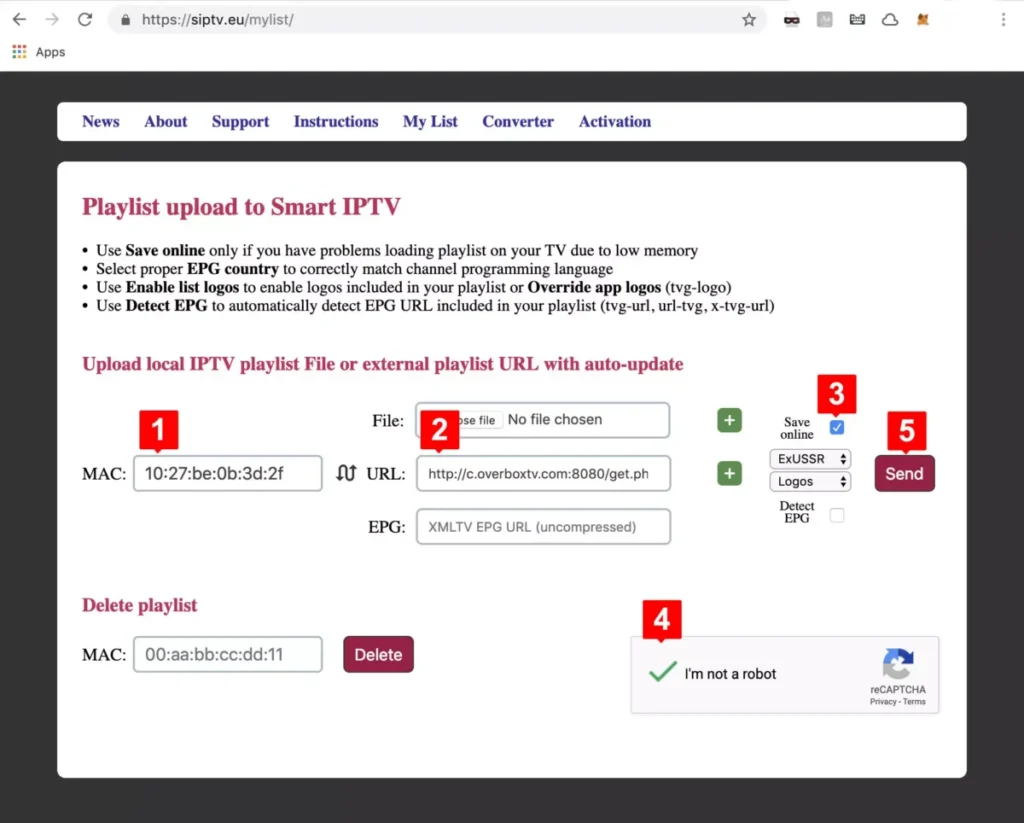 Go to siptv.eu/mylist, enter your MAC address in Delete, activate the captcha (I am not a robot), and click Delete.